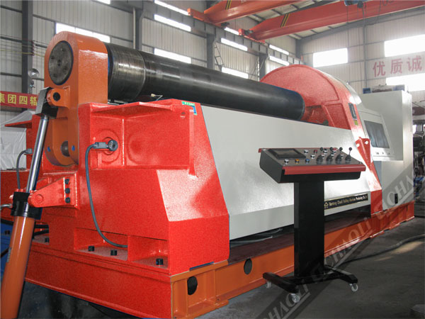 該設(shè)備具有板材端部的預(yù)彎功能,能將金屬板材一次上料,不需調(diào)頭即可完成板端預(yù)彎和工件的卷制成形。該機(jī)上工作輥為主驅(qū)動輥,下輥和兩側(cè)輥的升降均采用液壓傳動,升降位移由計算機(jī)控制,自動調(diào)平,屏幕顯示,翻轉(zhuǎn)軸承體的傾倒和復(fù)位采用液壓傳動,上輥的尾部裝有平衡機(jī)構(gòu),可以方便卸出卷制后的工件及筒體。設(shè)有移動式獨立操作臺,可隨時移動操作,機(jī)器設(shè)有安全聯(lián)鎖裝置,該機(jī)技術(shù)水平高,功能全,精度高,操作方便。是能源、交通、石油、化工、鍋爐、造船、水電、金屬結(jié)構(gòu)等行業(yè)卷制圓形、弧形和錐形工件理想的機(jī)型。