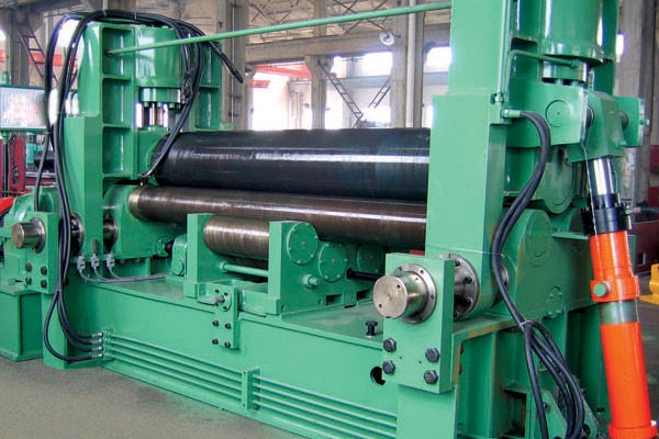 超力卷板機制造公司生產(chǎn)的三輥機械對稱式卷板機的結(jié)構型式為三輥對稱式,上輥在兩下輥中央對稱位置作垂直升降運動,通過絲桿絲母蝸桿傳動獲得,兩下輥作旋轉(zhuǎn)運動,由電機帶動。通過減速機的輸出齒輪與下輥齒輪嚙合,為卷制板材提供扭矩。該機缺點是板材端部需借助其它設備進行預彎。